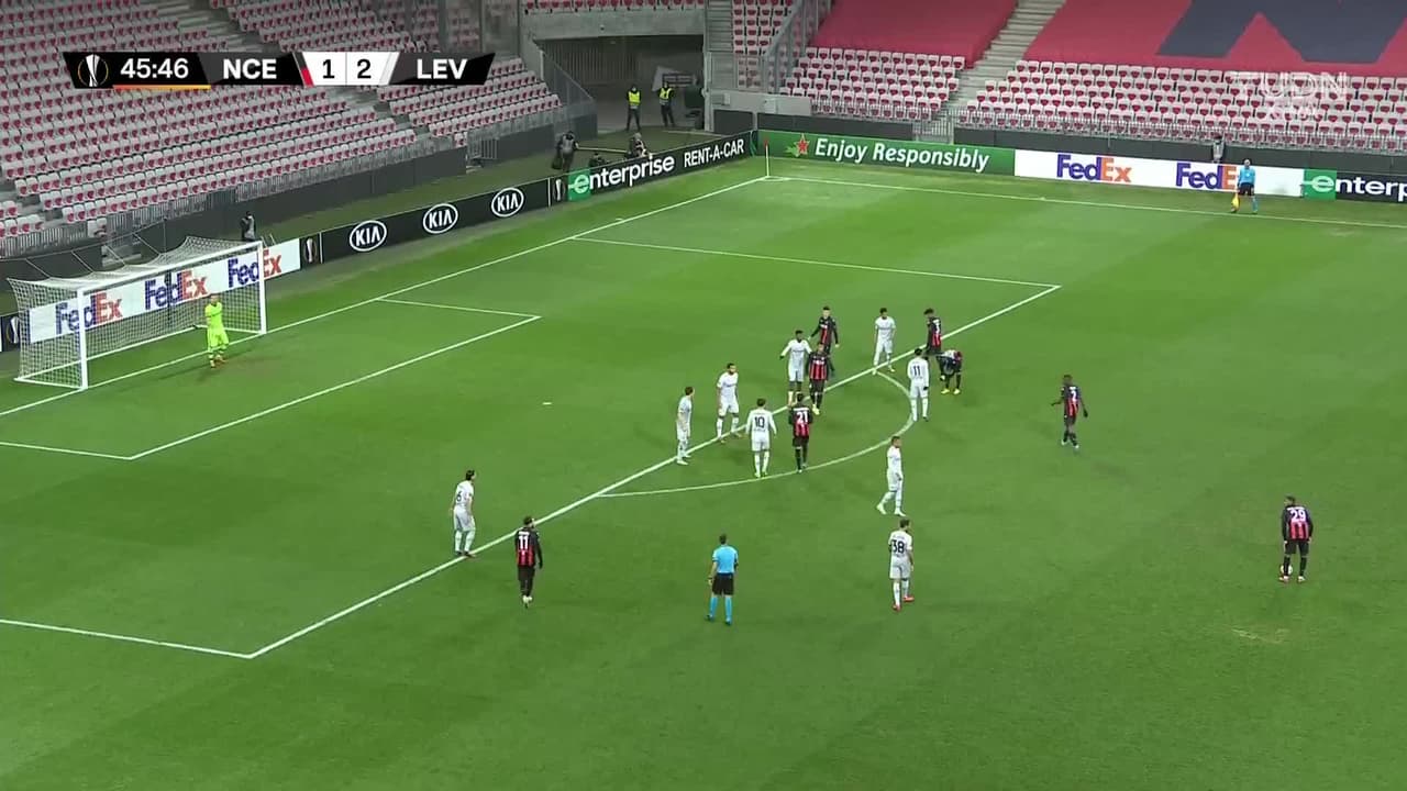 Tiro atajado raso al centro del arco. Jeff Reine-Adélaïde (Nice) Disparo con la derecha desde más de 30 metros.