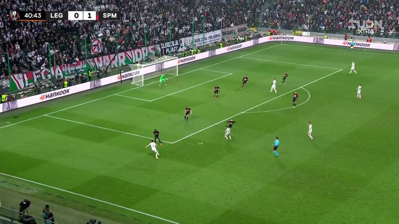Tiro atajado raso al centro del arco. Josué (Legia Warsaw) zurdazo desde fuera del área. Asistencia de Bartosz Slisz.