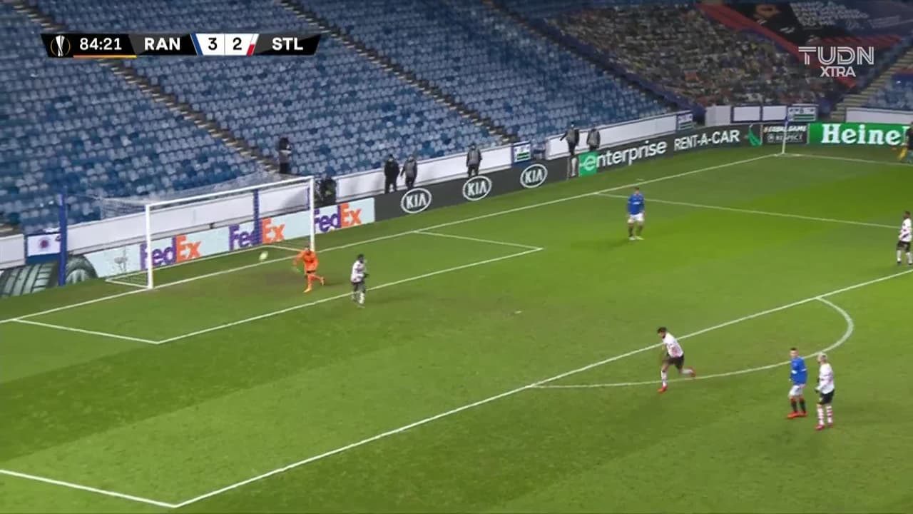 Tiro atajado raso al centro del arco. Kemar Roofe (Rangers) Disparo con la derecha desde el centro del área. Asistencia de Connor Goldson pase largo.
