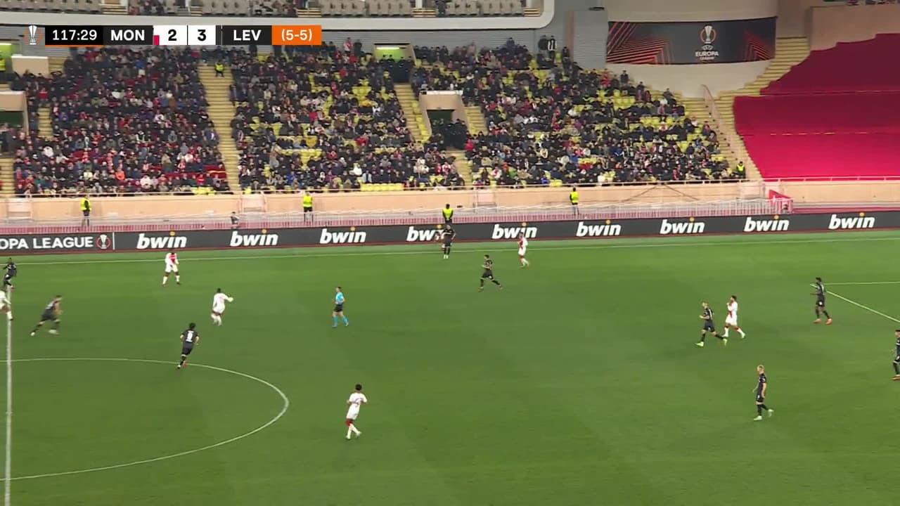 Tiro atajado. Kevin Volland (AS Monaco) disparo de cabeza desde el centro del área.