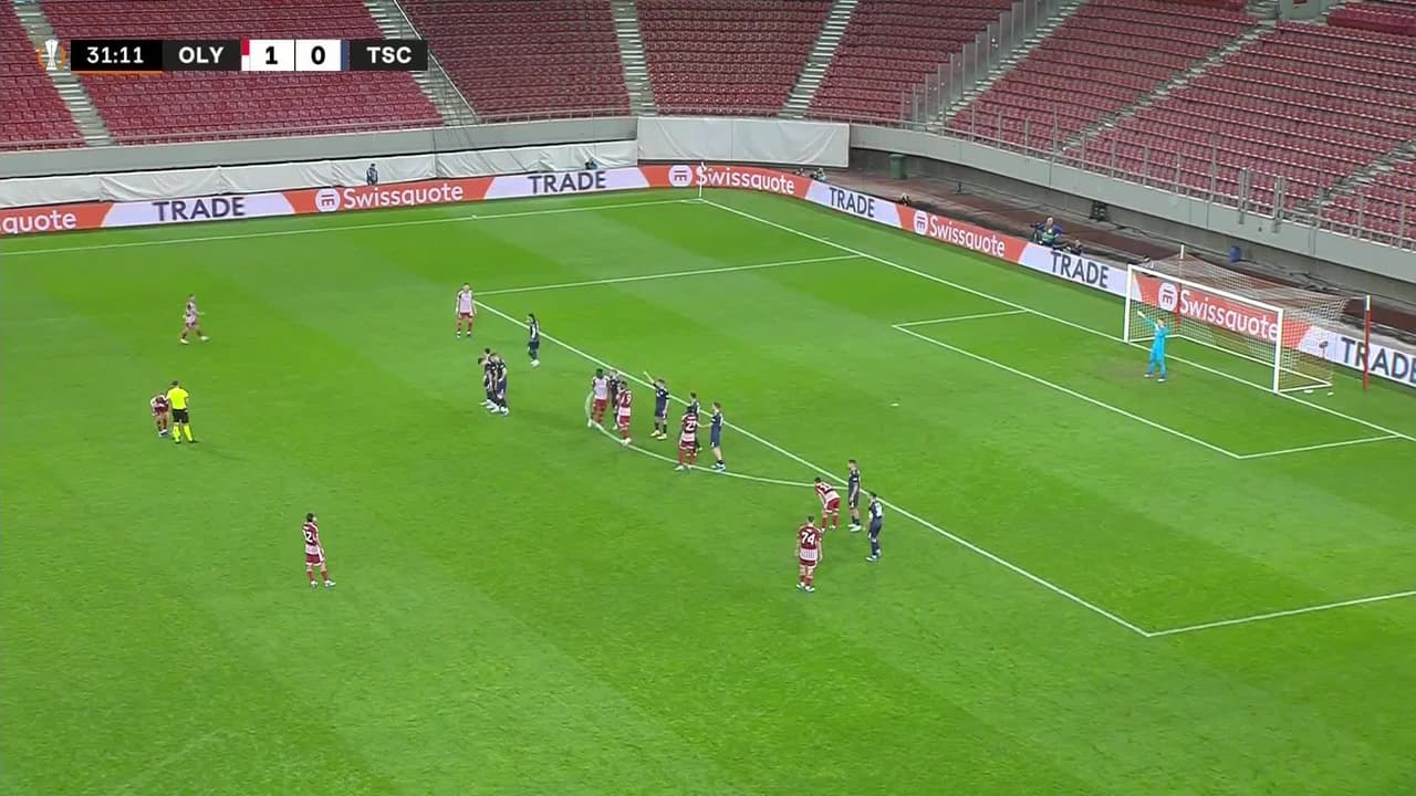 Tiro atajado por abajo a la izquierda. Konstantinos Fortounis (Olympiakos) Disparo con la derecha desde fuera del área.