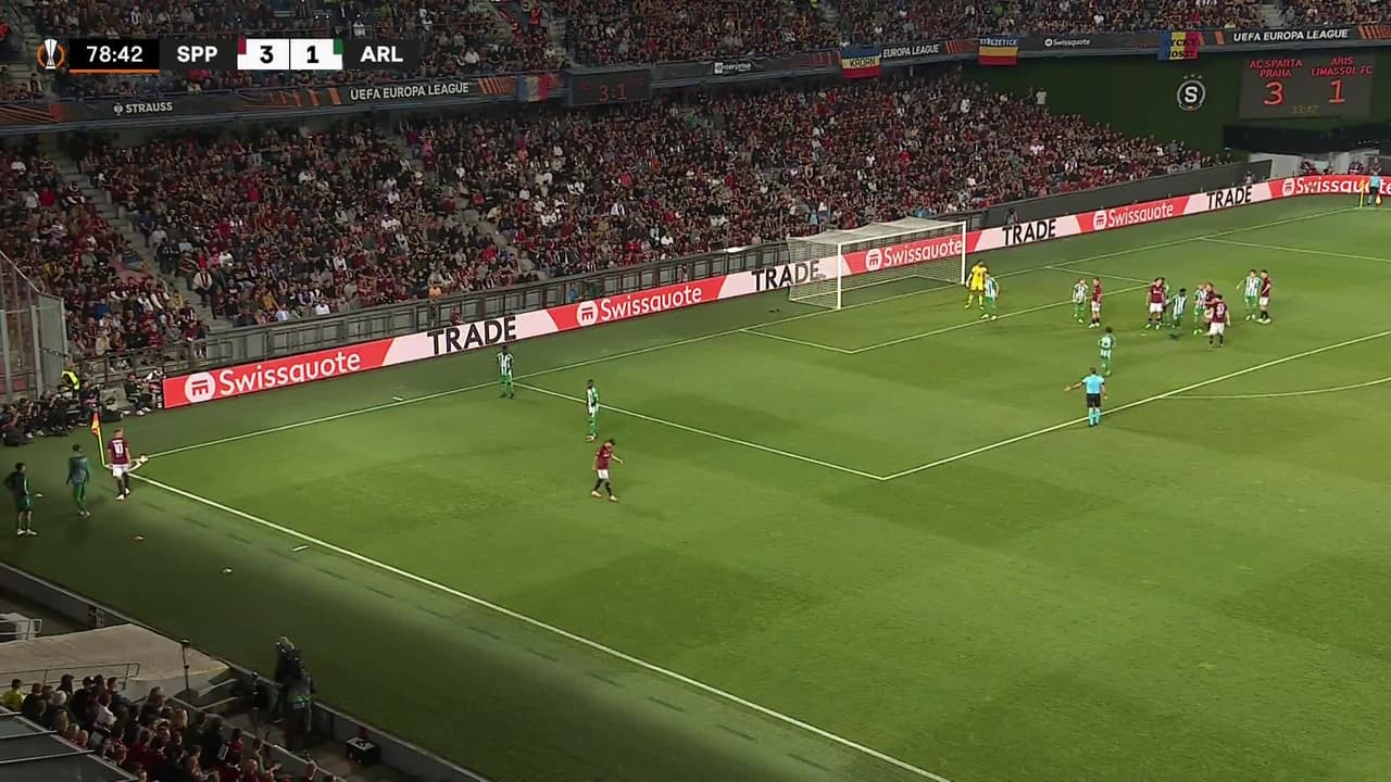 Tiro atajado por abajo a la izquierda. Ladislav Krejcí (Sparta Prague) disparo de cabeza desde el centro del área. Asistencia de Adam Karabec con un centro al área.