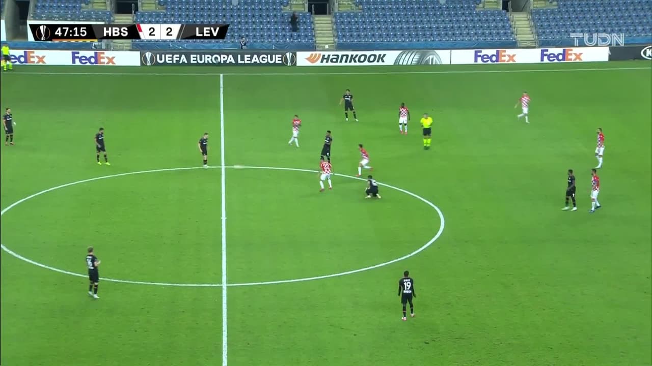 Tiro atajado junto al lado derecho de la portería. Leon Bailey (Bayer 04 Leverkusen) Disparo con la derecha desde el lado derecho dentro del área. Asistencia de Tin Jedvaj pase largo.
