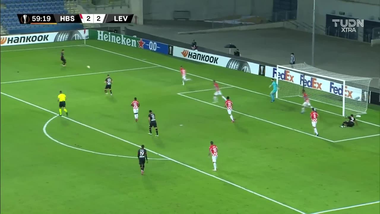 Tiro atajado por abajo a la izquierda. Leon Bailey (Bayer 04 Leverkusen) disparo de cabeza desde muy cerca. Asistencia de Wendell con un centro al área.