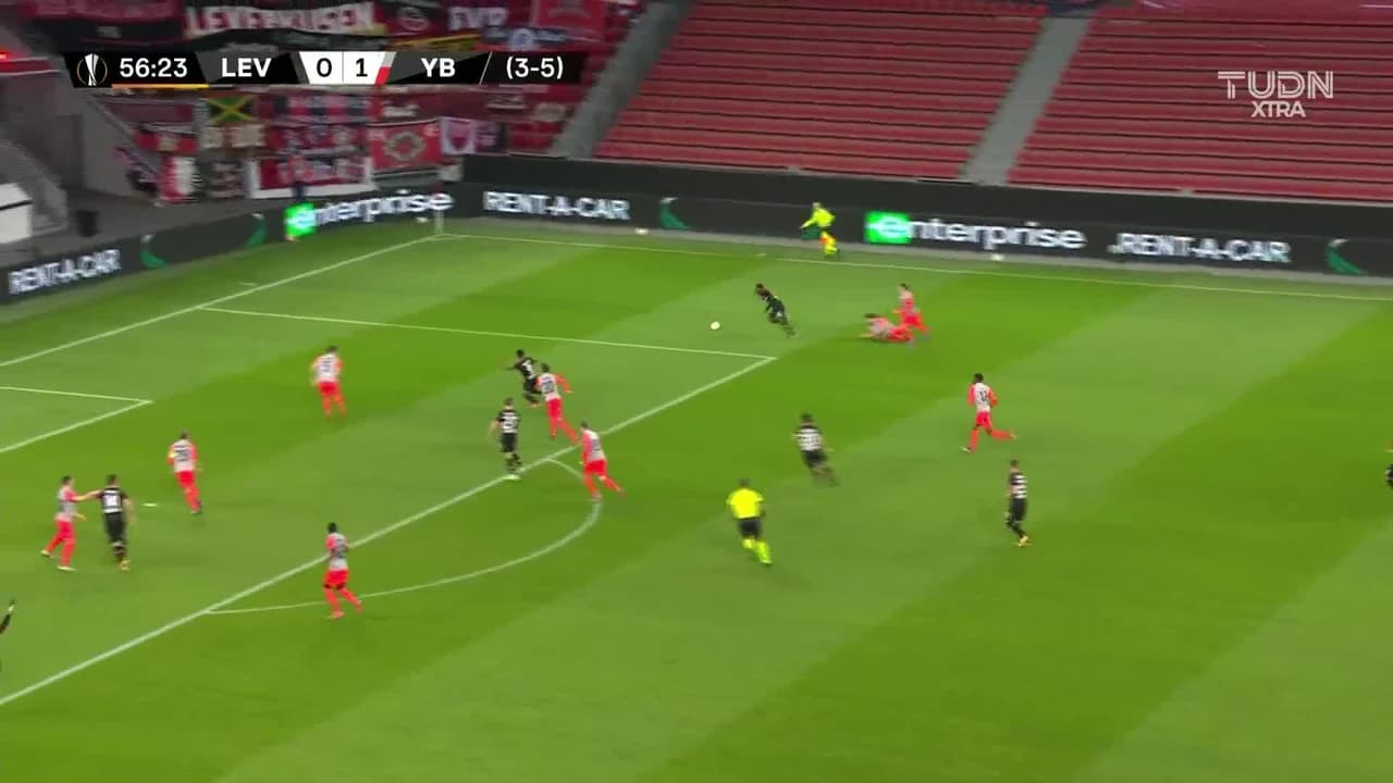 Tiro atajado. Leon Bailey (Bayer 04 Leverkusen) Disparo con la derecha a quemarropa desde el lado derecho.