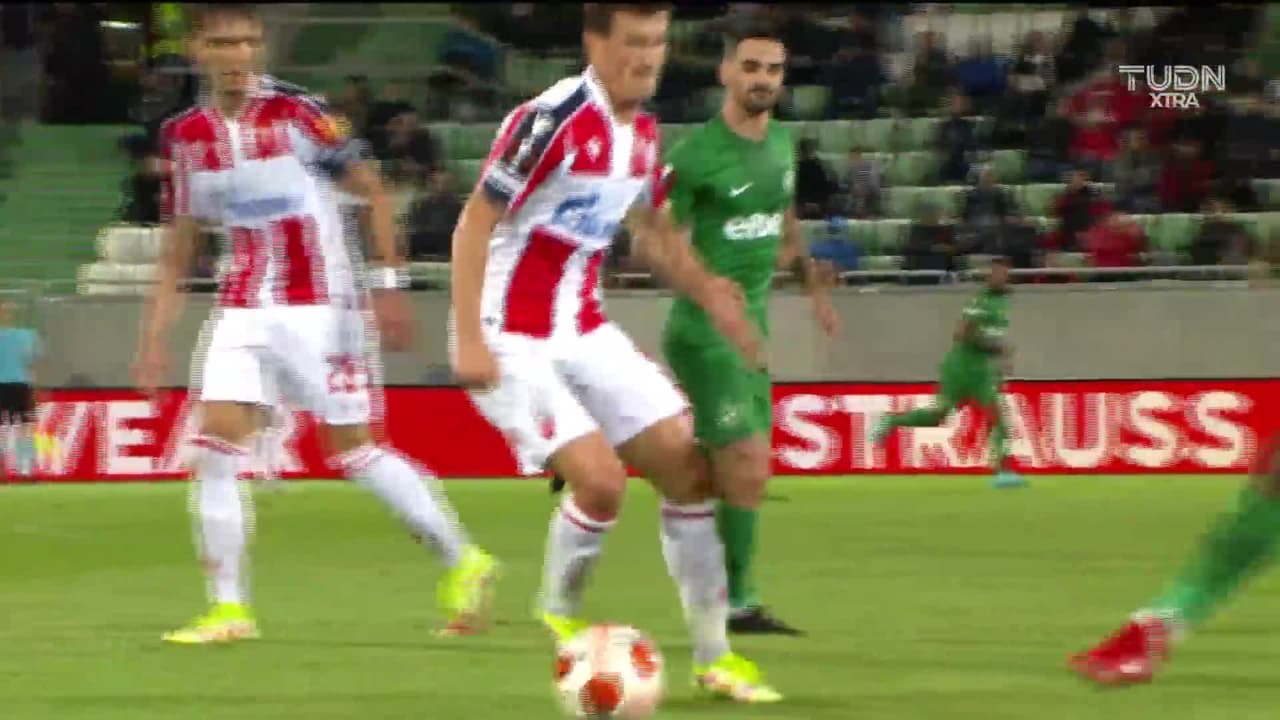 Remate parado bajo palos a rás de suelo. Lois Diony (Estrella Roja Belgrado) remate con la derecha desde fuera del área. Asistencia de Milan Rodic.