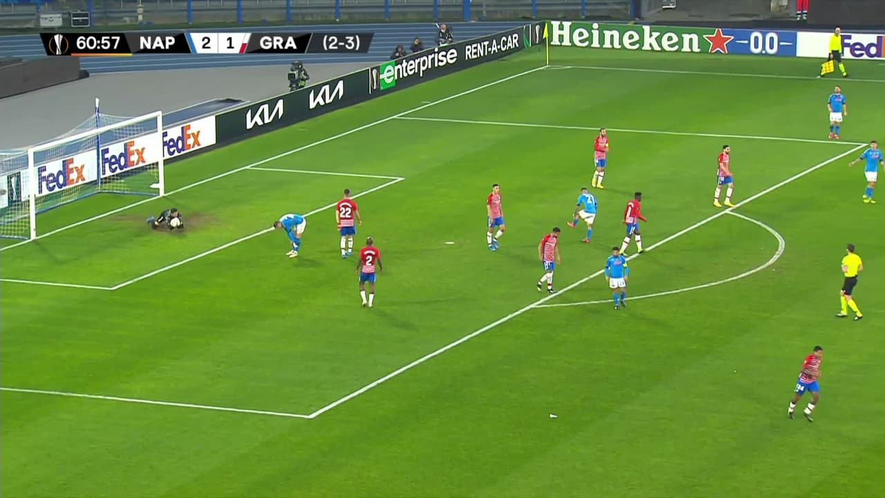 Tiro atajado raso al centro del arco. Lorenzo Insigne (Napoli) Disparo con la derecha desde el centro del área. Asistencia de Dries Mertens con un centro al área.