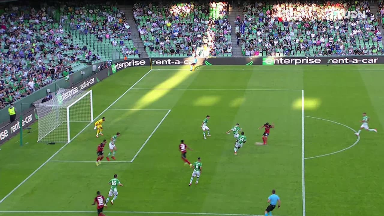 Tiro atajado por abajo a la izquierda. Lucas Alario (Bayer 04 Leverkusen) zurdazo desde el centro del área. Asistencia de Moussa Diaby con un centro al área.