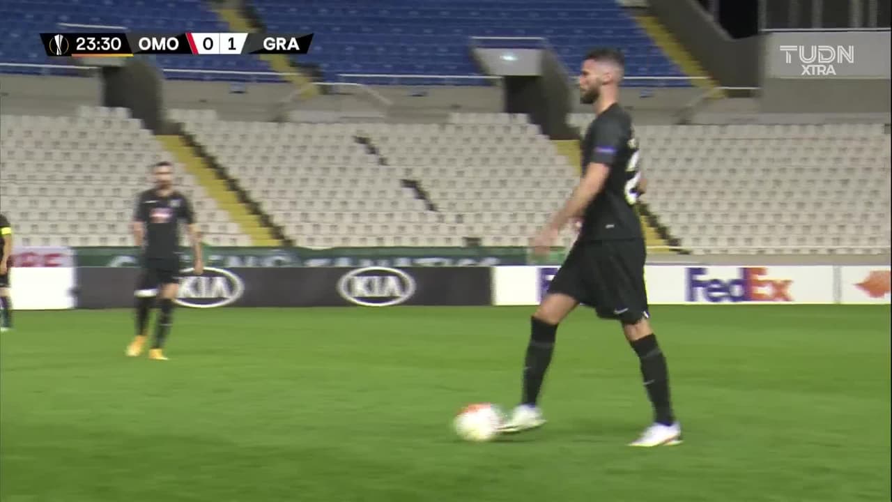 Tiro atajado. Luis Suárez (Granada CF) Disparo con la derecha desde fuera del área.