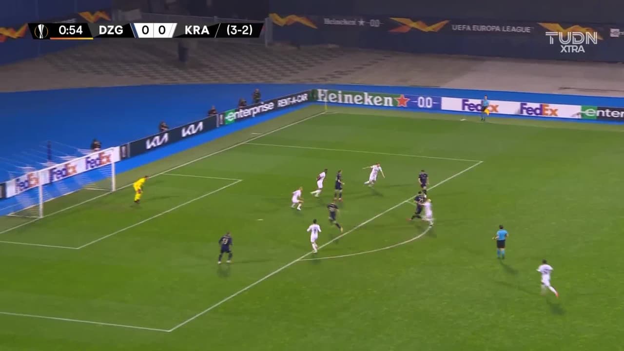 Tiro atajado. Luka Ivanusec (Dinamo Zagreb) zurdazo desde fuera del área.