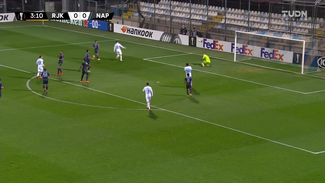 Tiro atajado por abajo a la izquierda. Luka Menalo (HNK Rijeka) Disparo con la derecha desde fuera del área. Asistencia de Robert Muric pase largo.