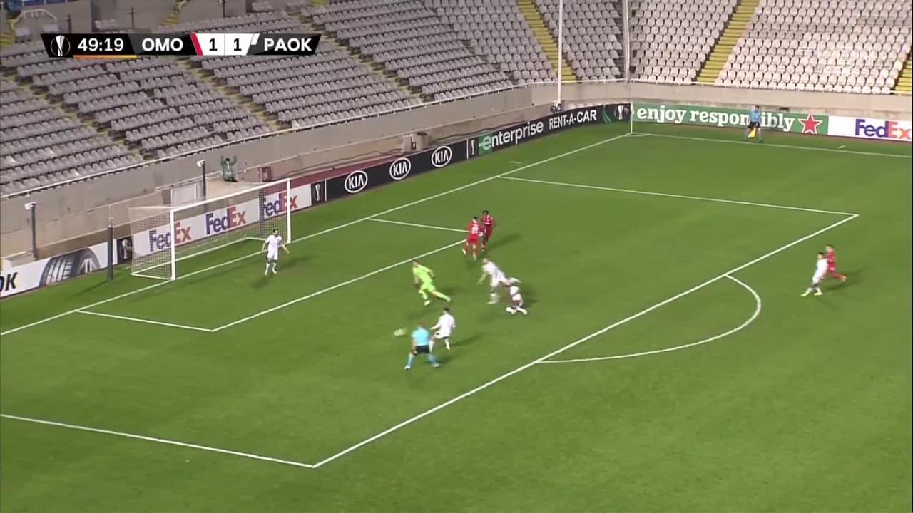 Tiro atajado raso al centro del arco. Mamadou Kaly Sene (Omonia Nicosia) Disparo con la derecha desde el centro del área.