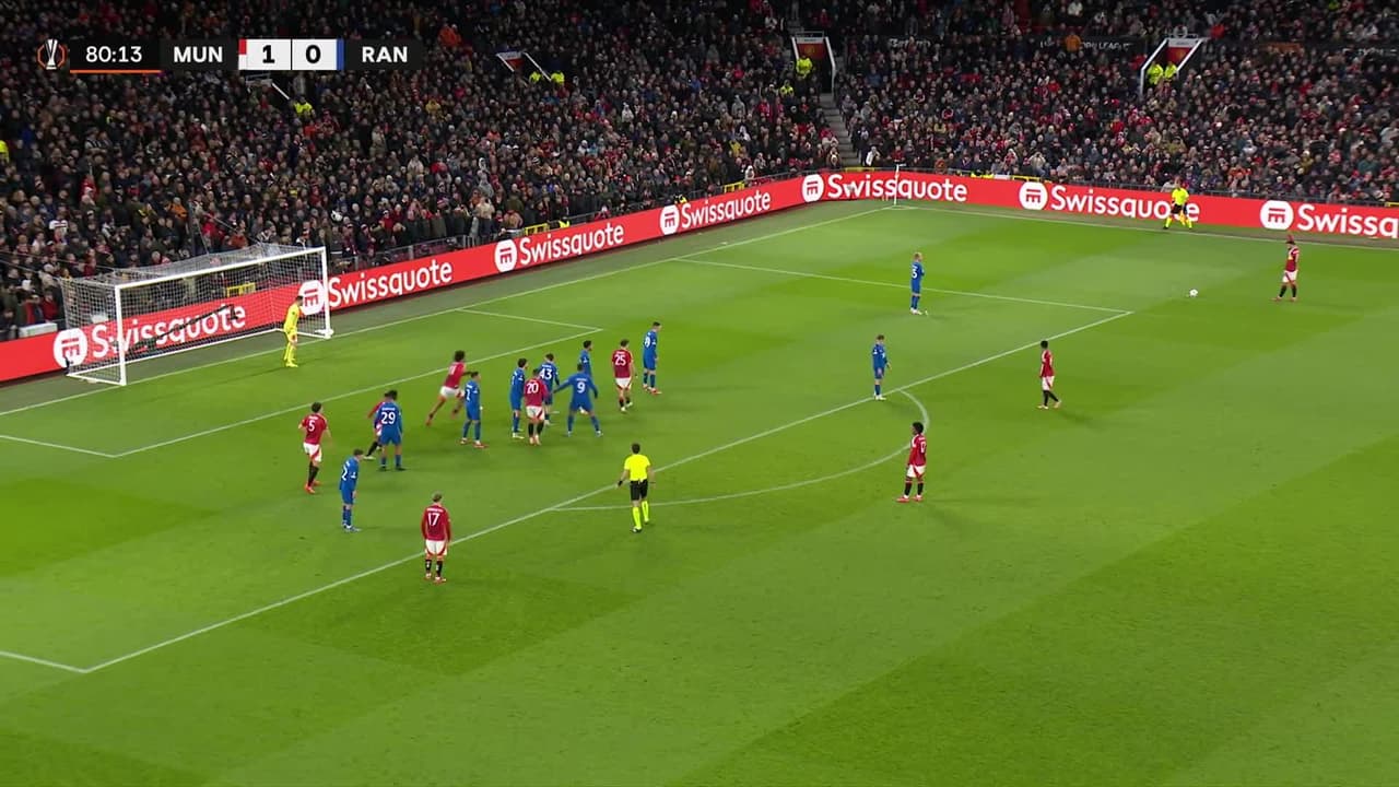 Tiro atajado junto al lado derecho de la portería. Manuel Ugarte (Manchester United) disparo de cabeza desde el centro del área. Asistencia de Bruno Fernandes con un centro al área.