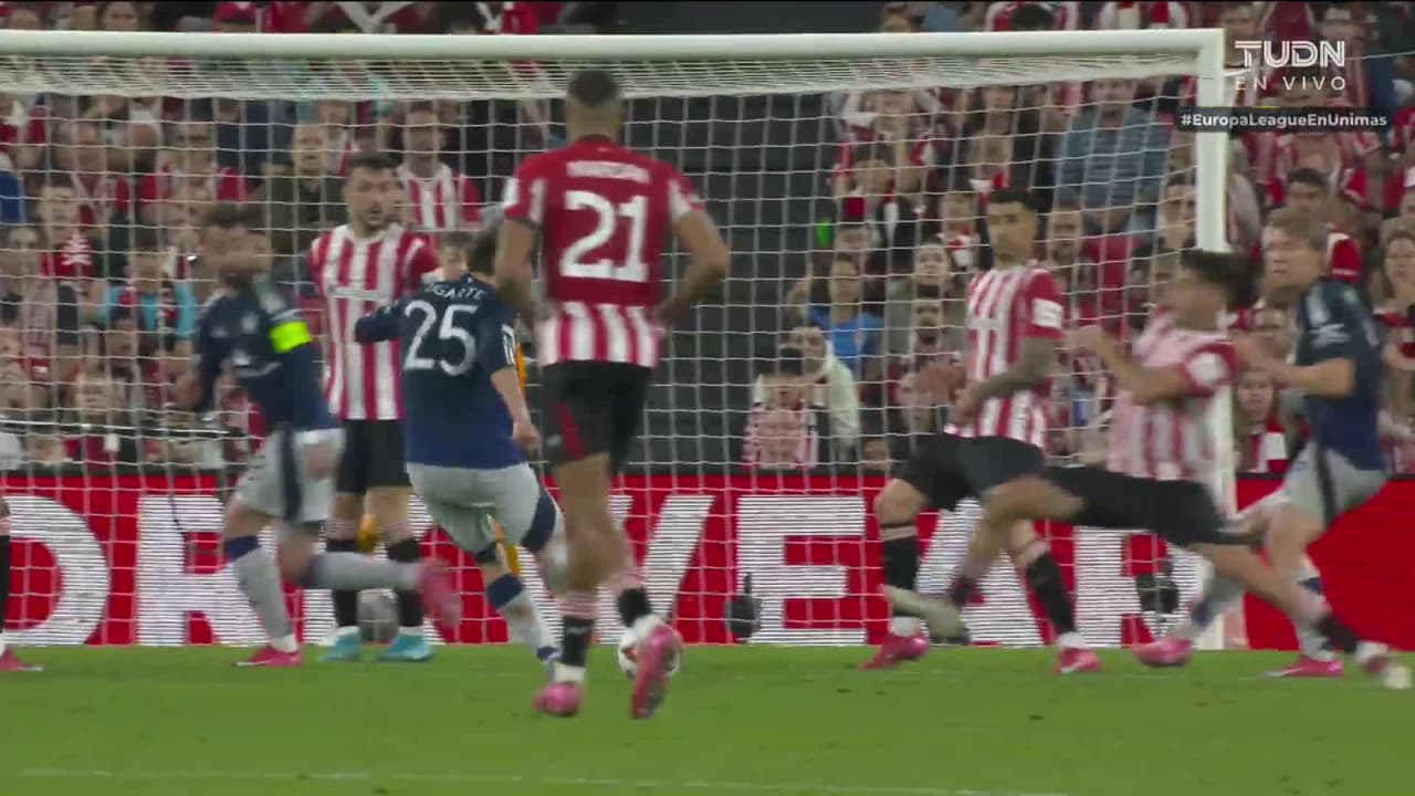 Tiro atajado. Manuel Ugarte (Manchester United) Disparo con la derecha desde fuera del área.