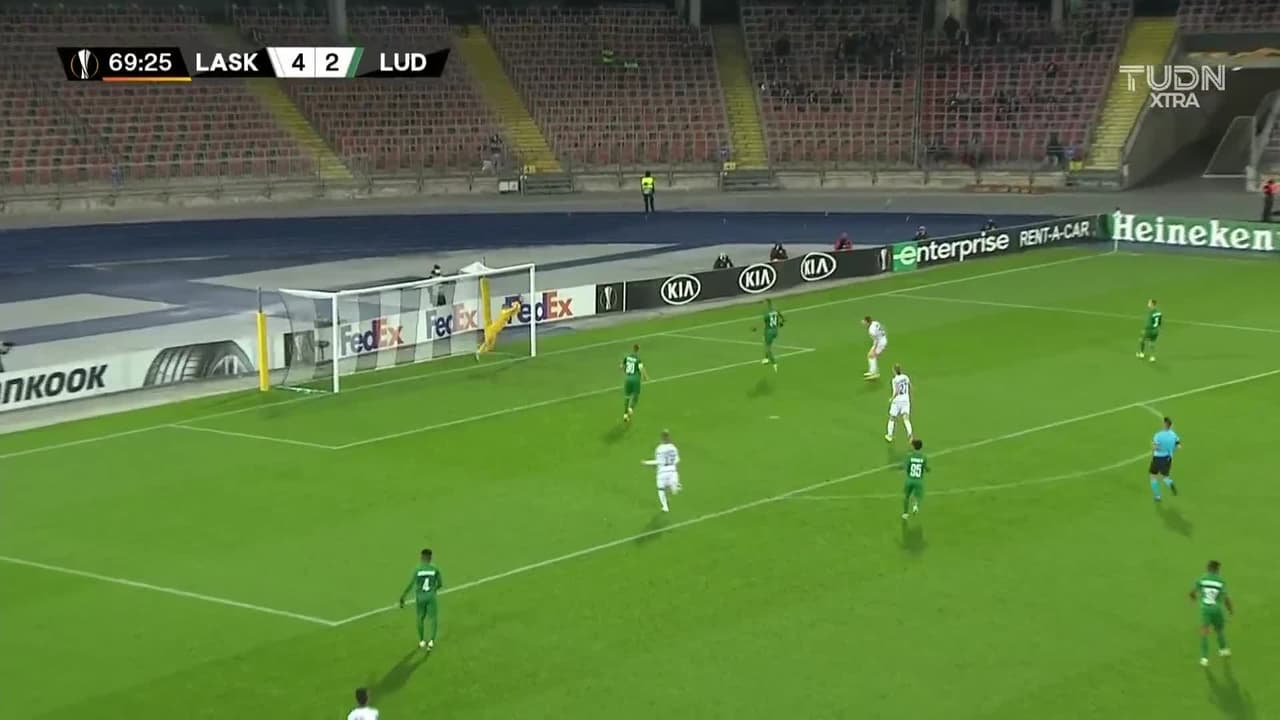 Tiro atajado al ángulo superior derecho. Marko Raguz (LASK) disparo de cabeza desde el centro del área. Asistencia de Andrés Andrade con un centro al área.