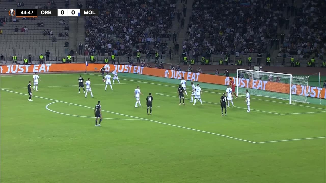 Tiro atajado Por arriba en el centro del arco. Matheus Silva (Qarabag) Disparo con la derecha desde fuera del área. Asistencia de Marko Jankovic.