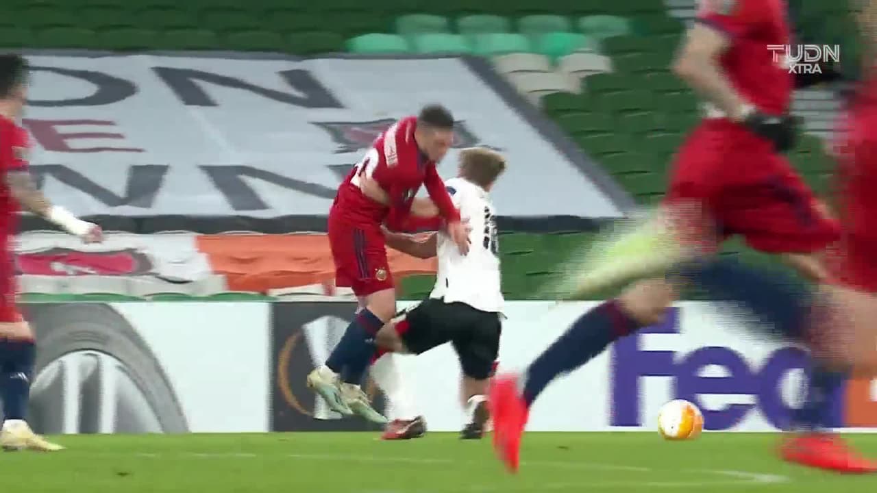 Tiro atajado. Maximilian Ullmann (SK Rapid Wien) zurdazo desde muy lejos por la izquierda y en posición complicada.