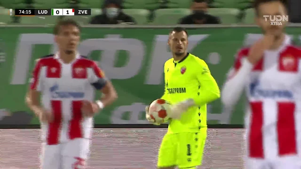 Remate parado bajo palos a rás de suelo. Milan Pavkov (Estrella Roja Belgrado) remate con la derecha desde fuera del área.
