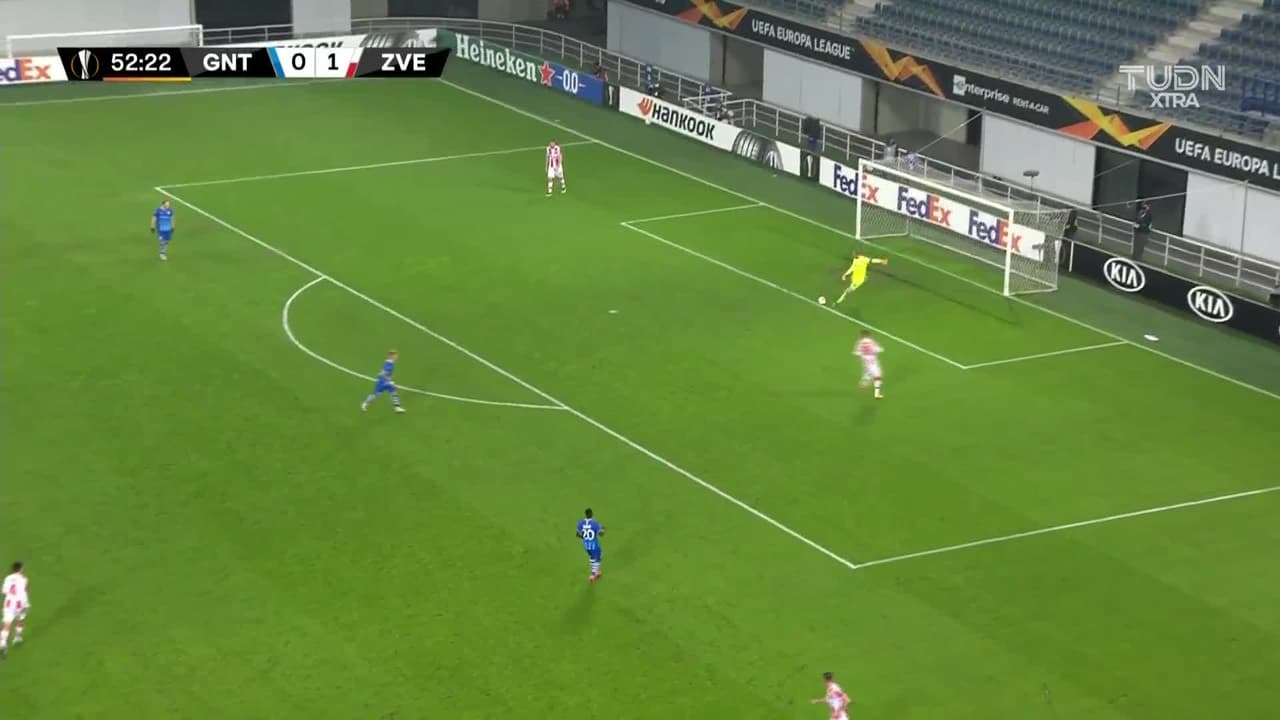 Tiro atajado raso al centro del arco. Milos Degenek (Estrella Roja de Belgrado) Disparo con la derecha desde fuera del área.