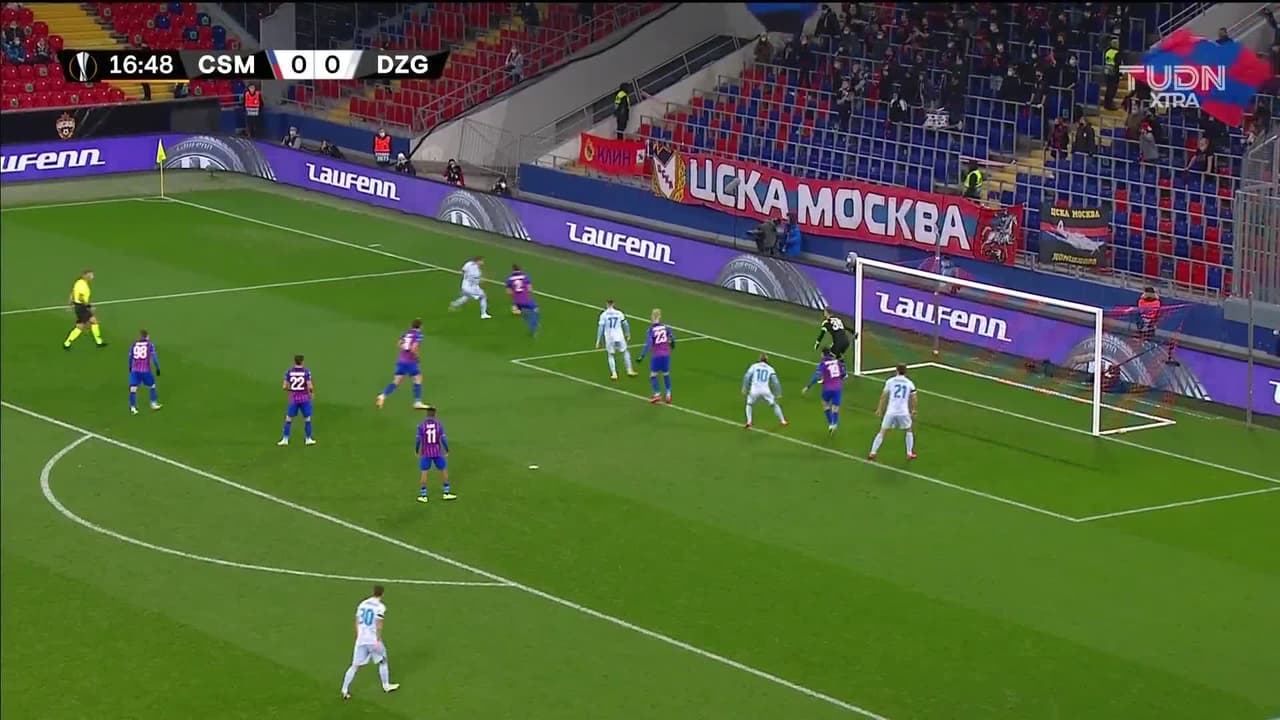 Tiro atajado por abajo a la izquierda. Mislav Orsic (Dinamo Zagreb) Disparo con la derecha desde fuera del área. Asistencia de Arijan Ademi.