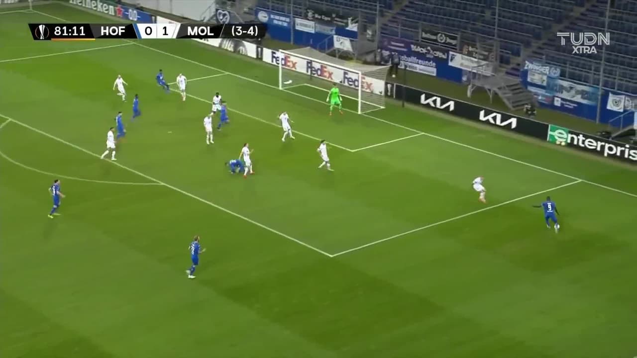 Tiro atajado. Munas Dabbur (TSG 1899 Hoffenheim) disparo de cabeza desde muy cerca.