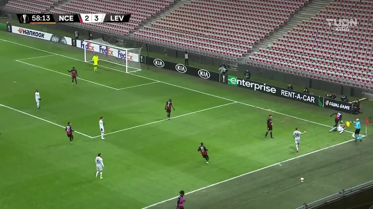 Tiro atajado. Nadiem Amiri (Bayer 04 Leverkusen) Disparo con la derecha desde fuera del área.