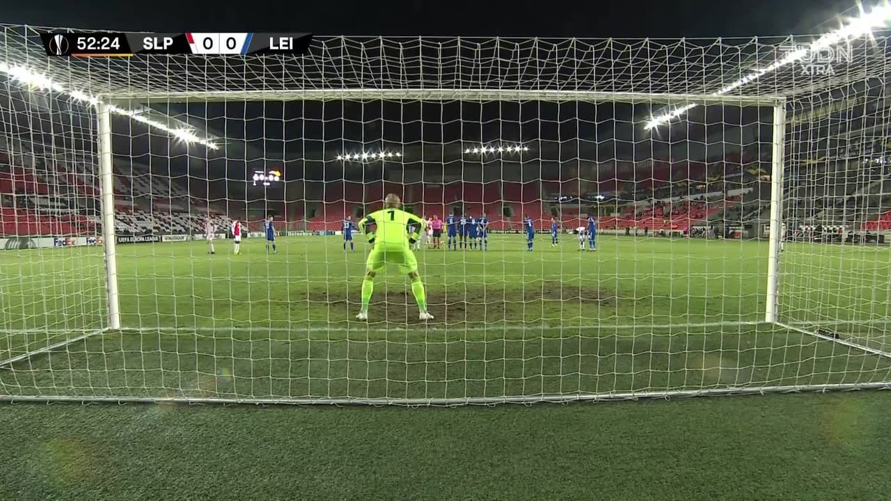 Tiro atajado al ángulo superior derecho. Nicolae Claudiu Stanciu (Slavia Prague) Disparo con la derecha desde fuera del área.