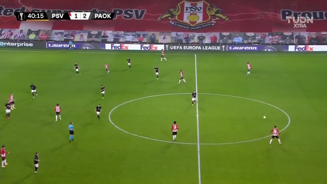 Tiro atajado raso al centro del arco. Noni Madueke (PSV Eindhoven) zurdazo desde el lado izquierdo dentro del área. Asistencia de Philipp Max.