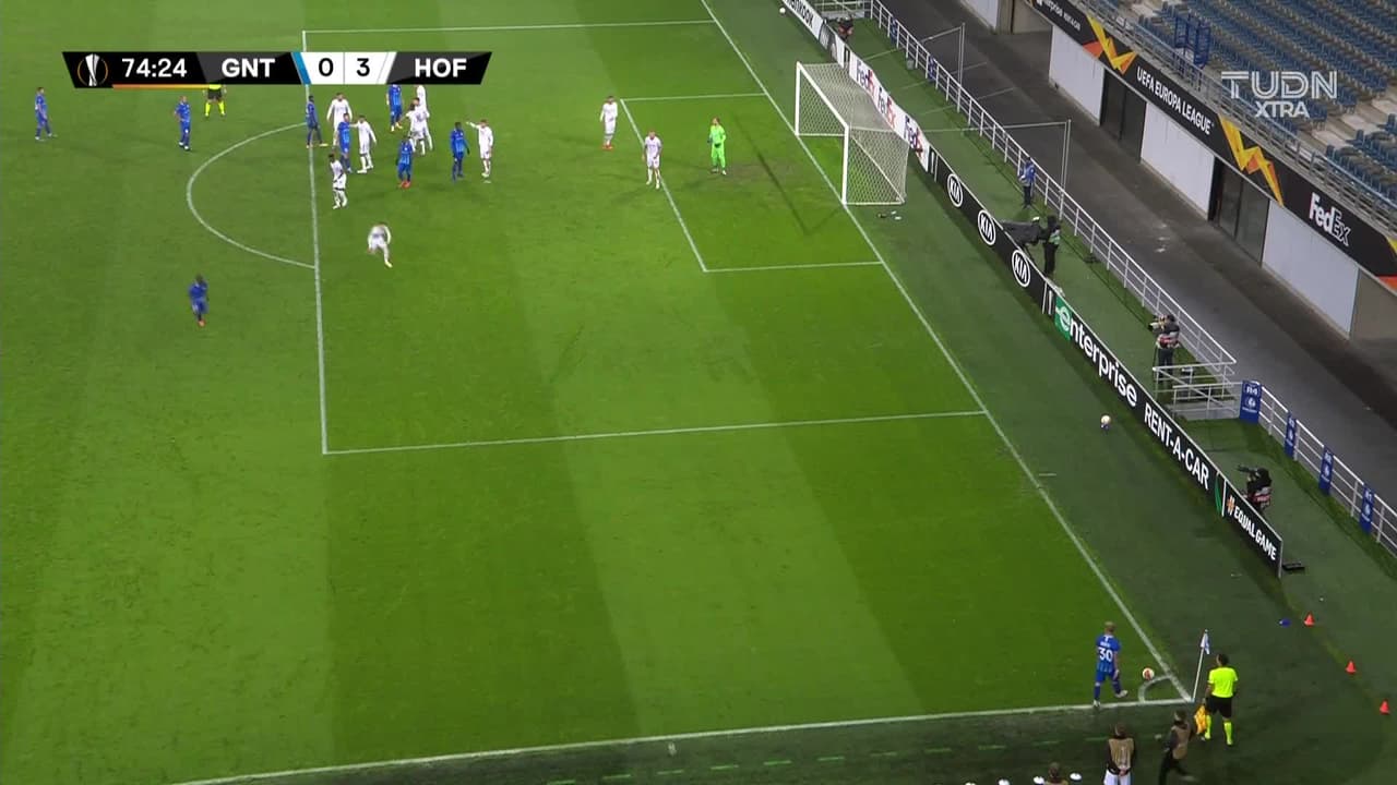 Tiro atajado raso al centro del arco. Nurio Fortuna (KAA Gent) disparo de cabeza desde el centro del área. Asistencia de Niklas Dorsch con un centro al área.