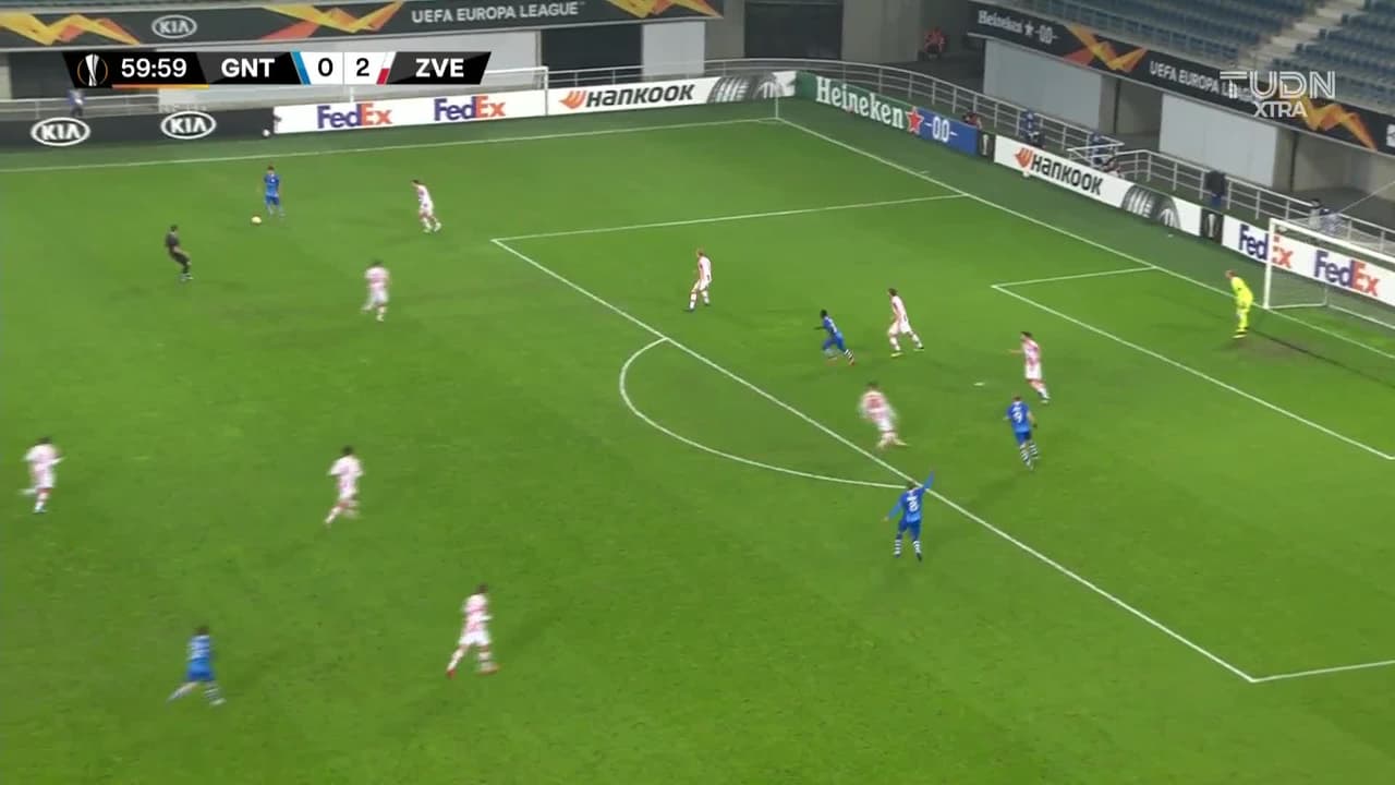 Tiro atajado raso al centro del arco. Nurio Fortuna (KAA Gent) zurdazo desde más de 30 metros. Asistencia de Andreas Hanche-Olsen pase largo.