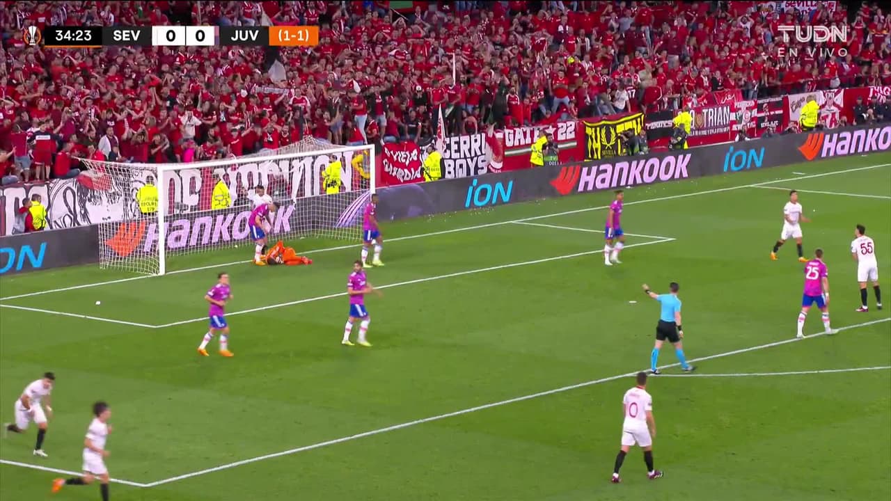 Tiro atajado por abajo a la izquierda. Óliver Torres (Sevilla) disparo de cabeza desde el centro del área. Asistencia de Marcos Acuña con un centro al área.