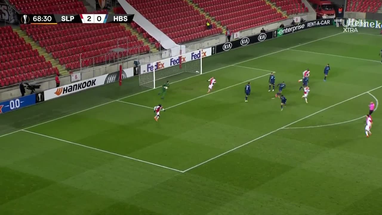 Tiro atajado al ángulo superior derecho. Ondrej Lingr (Slavia Prague) disparo de cabeza desde el centro del área. Asistencia de Lukas Masopust con un centro al área.