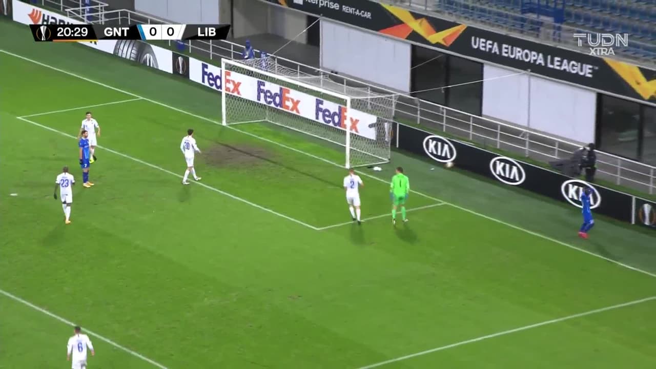 Tiro atajado junto al lado derecho de la portería. Osman Bukari (KAA Gent) Disparo con la derecha desde el lado derecho dentro del área.