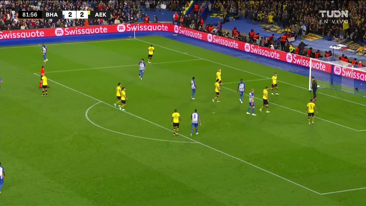 Tiro atajado raso al centro del arco. Pascal Groß (Brighton and Hove Albion) Disparo con la derecha desde fuera del área.