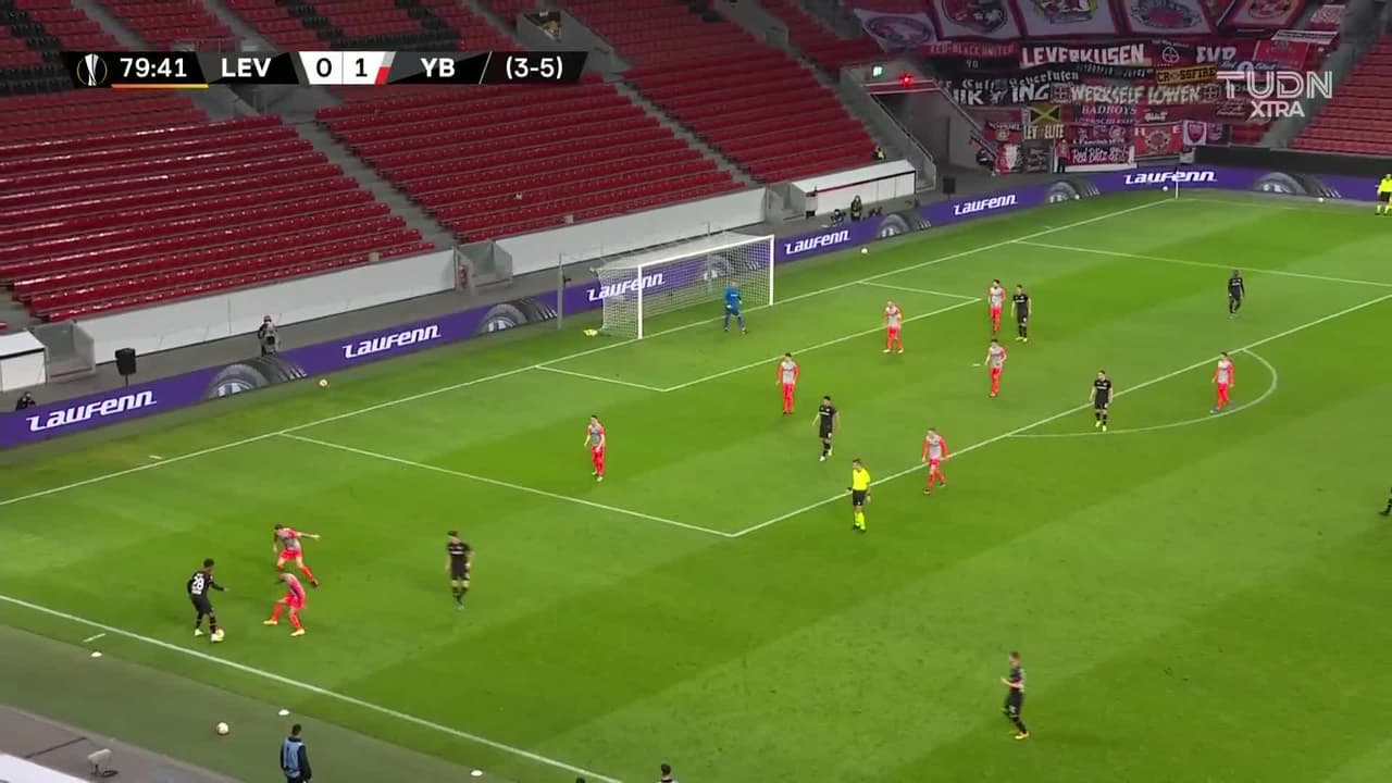 Tiro atajado por abajo a la izquierda. Patrik Schick (Bayer 04 Leverkusen) disparo de cabeza desde el centro del área. Asistencia de Daley Sinkgraven con un centro al área.
