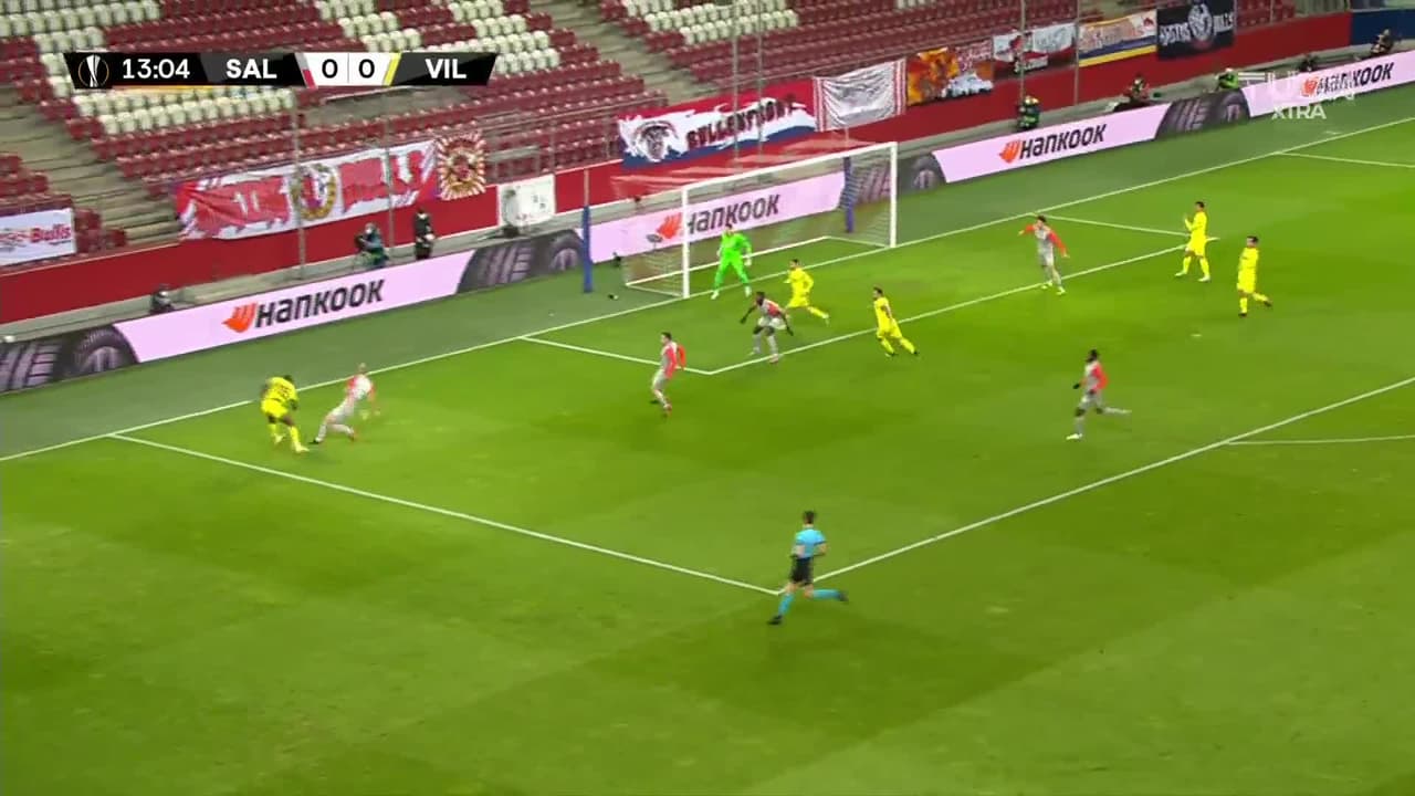 Tiro atajado. Patson Daka (FC Red Bull Salzburg) Disparo con la derecha desde el lado derecho dentro del área.