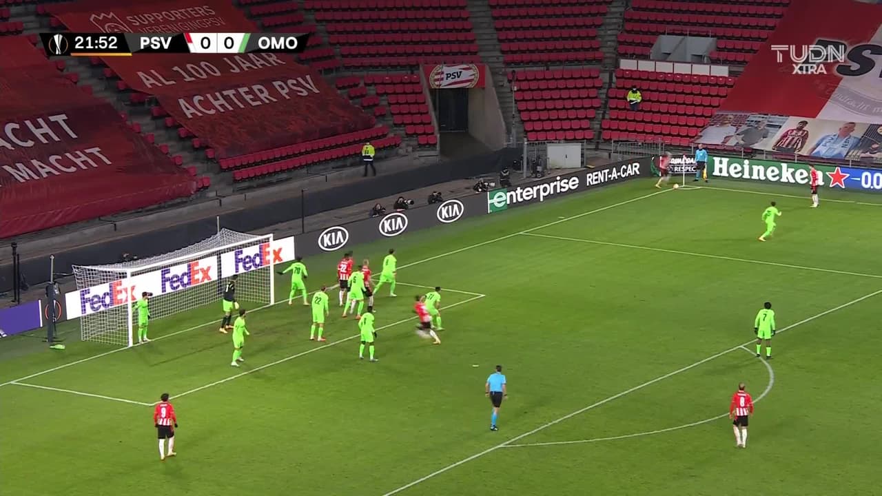 Tiro atajado Por arriba en el centro del arco. Philipp Max (PSV Eindhoven) zurdazo desde fuera del área. Asistencia de Mohamed Ihattaren.