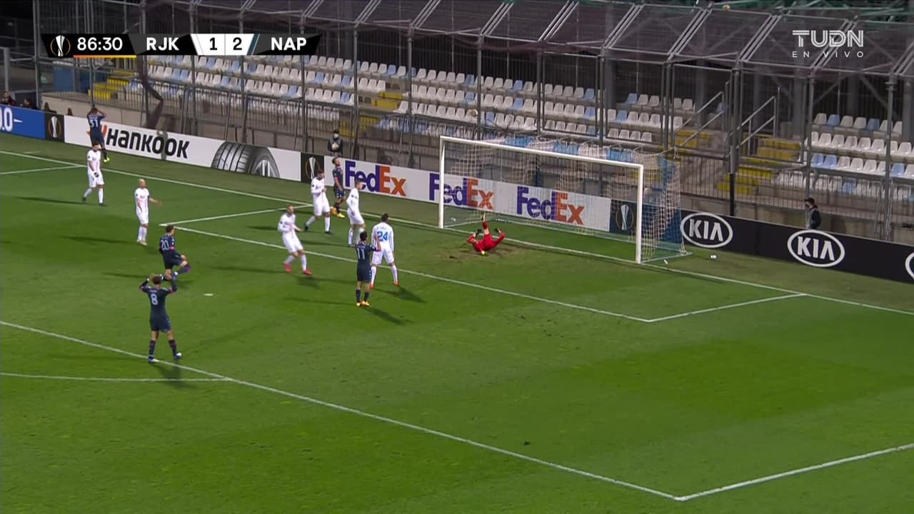 Tiro atajado por abajo a la izquierda. Piotr Zielinski (Napoli) Disparo con la derecha desde el centro del área. Asistencia de Faouzi Ghoulam.