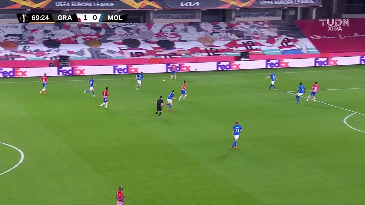 Tiro atajado por abajo a la izquierda. Roberto Soldado (Granada CF) Disparo con la derecha desde fuera del área.