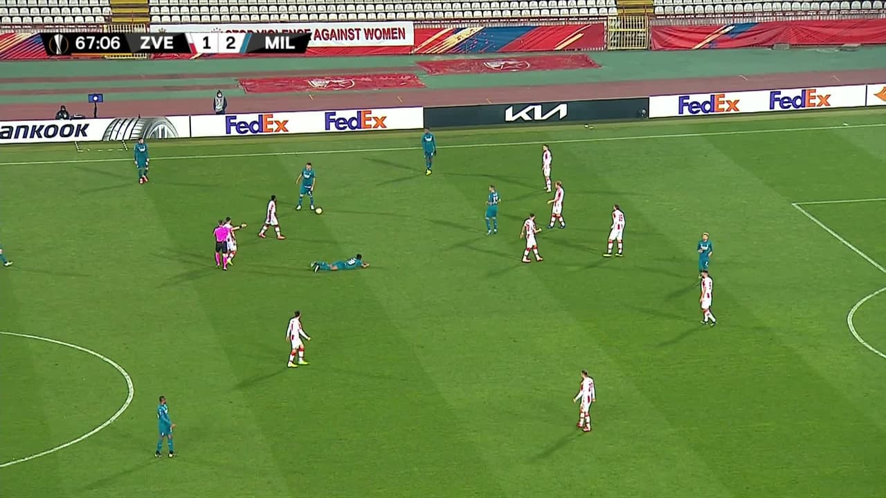 Tiro atajado. Samu Castillejo (Milan) zurdazo desde el centro del área.