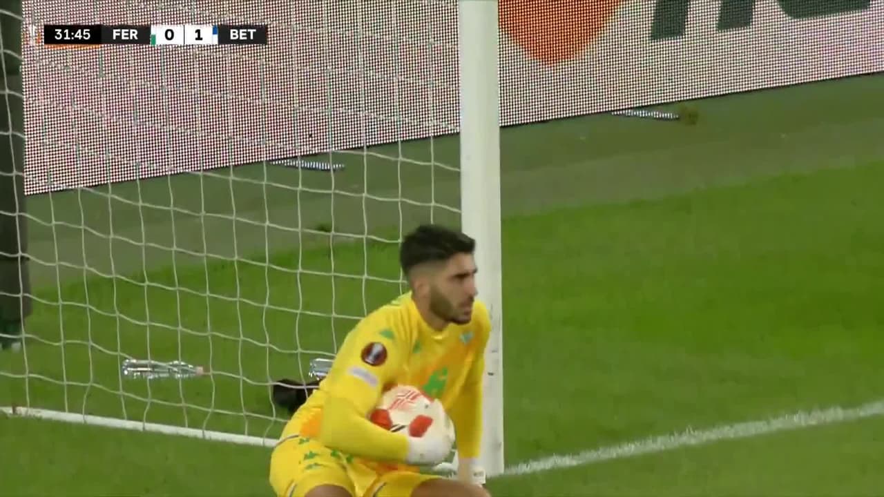 Tiro atajado junto al lado derecho de la portería. Samy Mmaee (Ferencvárosi TC) disparo de cabeza desde el centro del área. Asistencia de Myrto Uzuni con un centro al área.