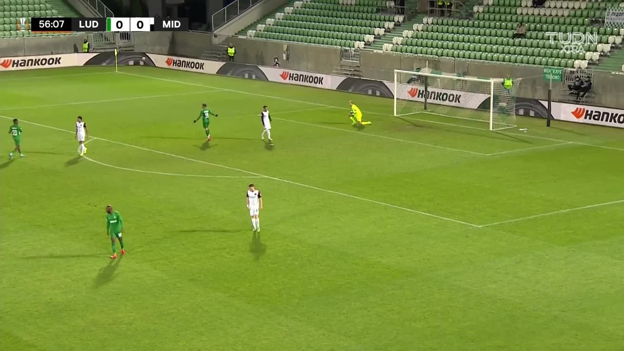 Tiro atajado raso al centro del arco. Show (Ludogorets Razgrad) Disparo con la derecha desde fuera del área. Asistencia de Stéphane Badji.