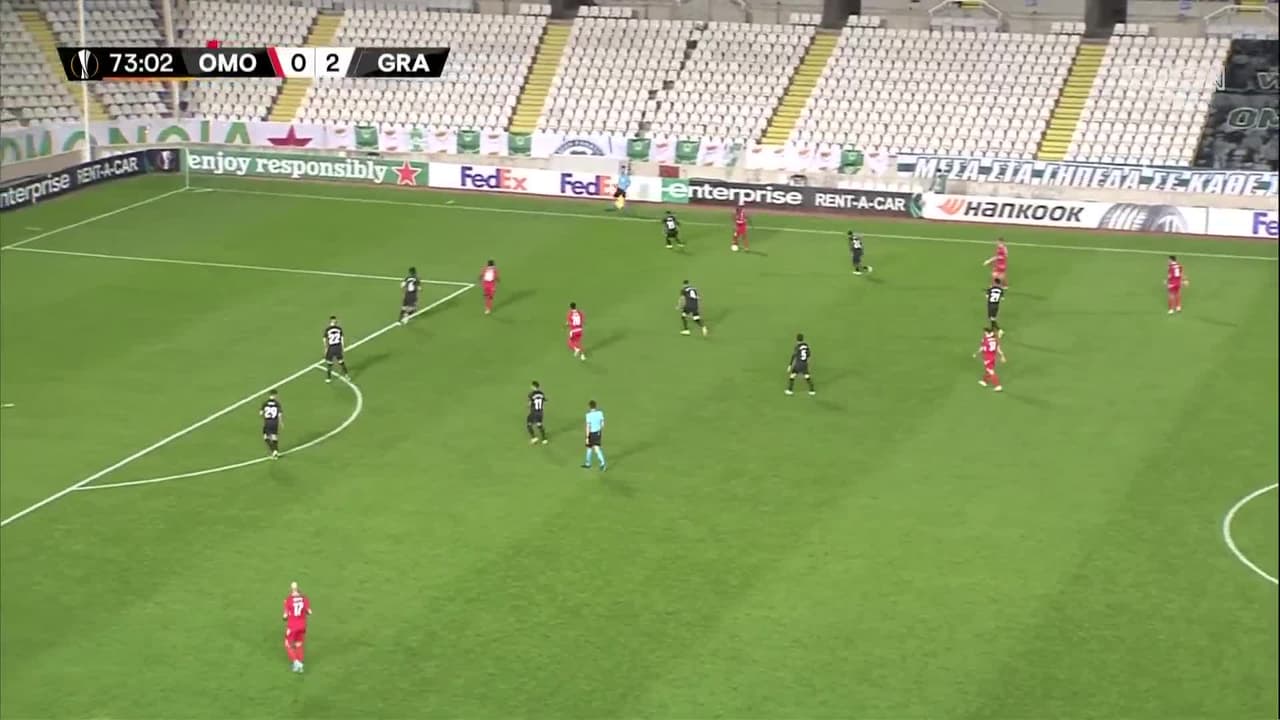 Tiro atajado junto al lado derecho de la portería. Thiago Santos (Omonia Nicosia) zurdazo desde fuera del área. Asistencia de Ernest Asante con un centro al área.