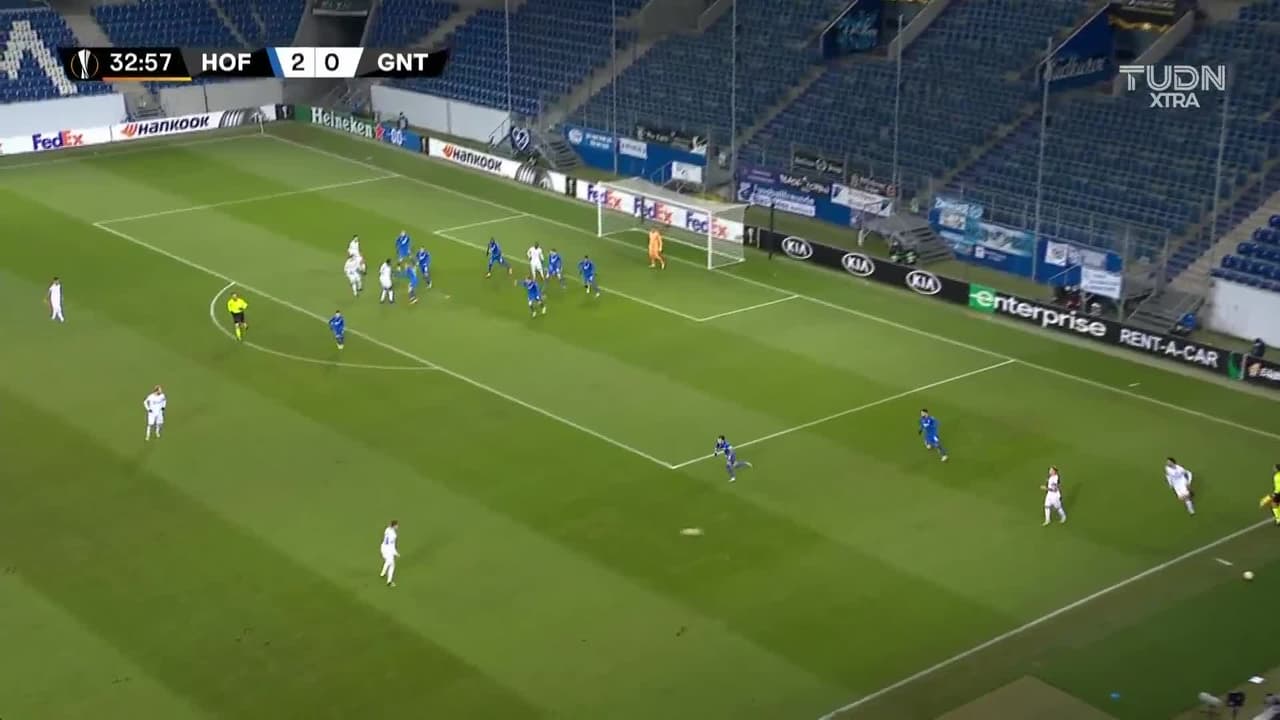 Tiro atajado por abajo a la izquierda. Tim Kleindienst (KAA Gent) disparo de cabeza desde el centro del área. Asistencia de Milad Mohammadi con un centro al área.