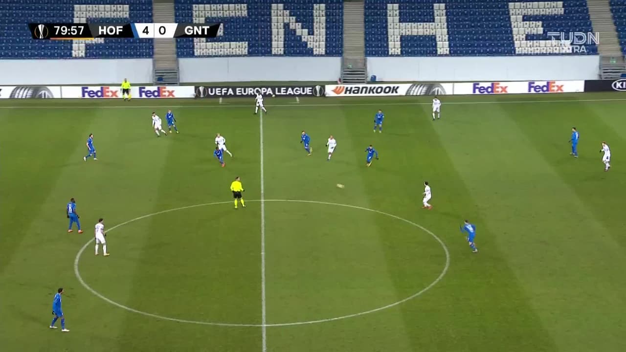 Tiro atajado raso al centro del arco. Tim Kleindienst (KAA Gent) Disparo con la derecha desde el centro del área.