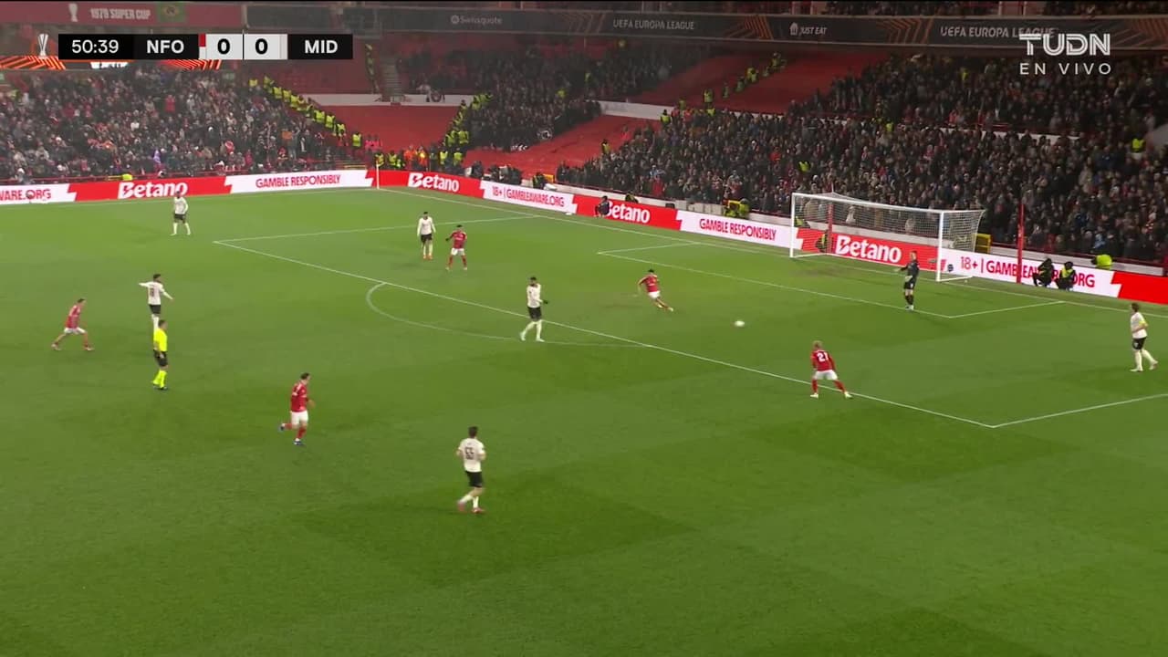 Tiro atajado por abajo a la izquierda. Valdemar Byskov (FC Midtjylland) Disparo con la derecha desde fuera del área.