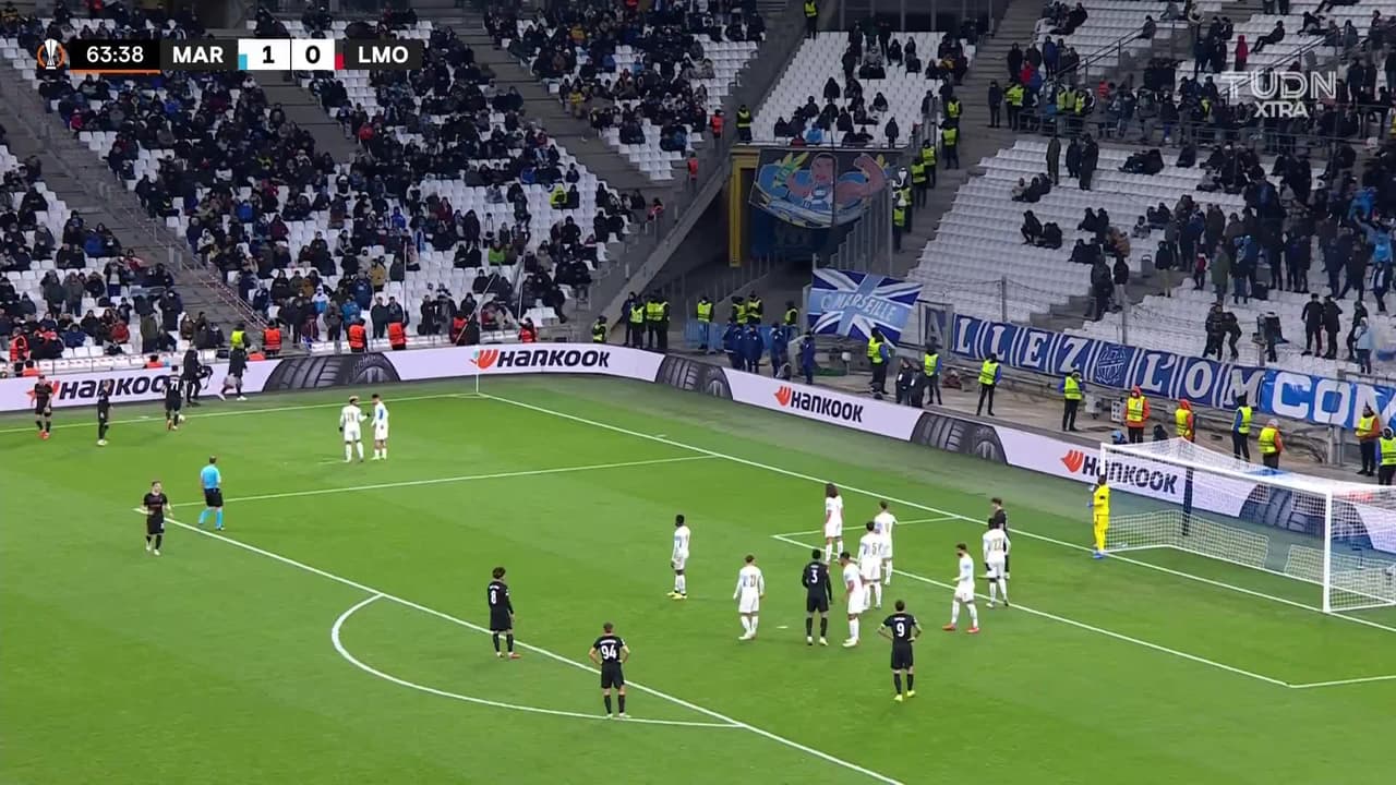 Tiro atajado. Valentin Rongier (Marseille) disparo de cabeza desde más de 30 metros.