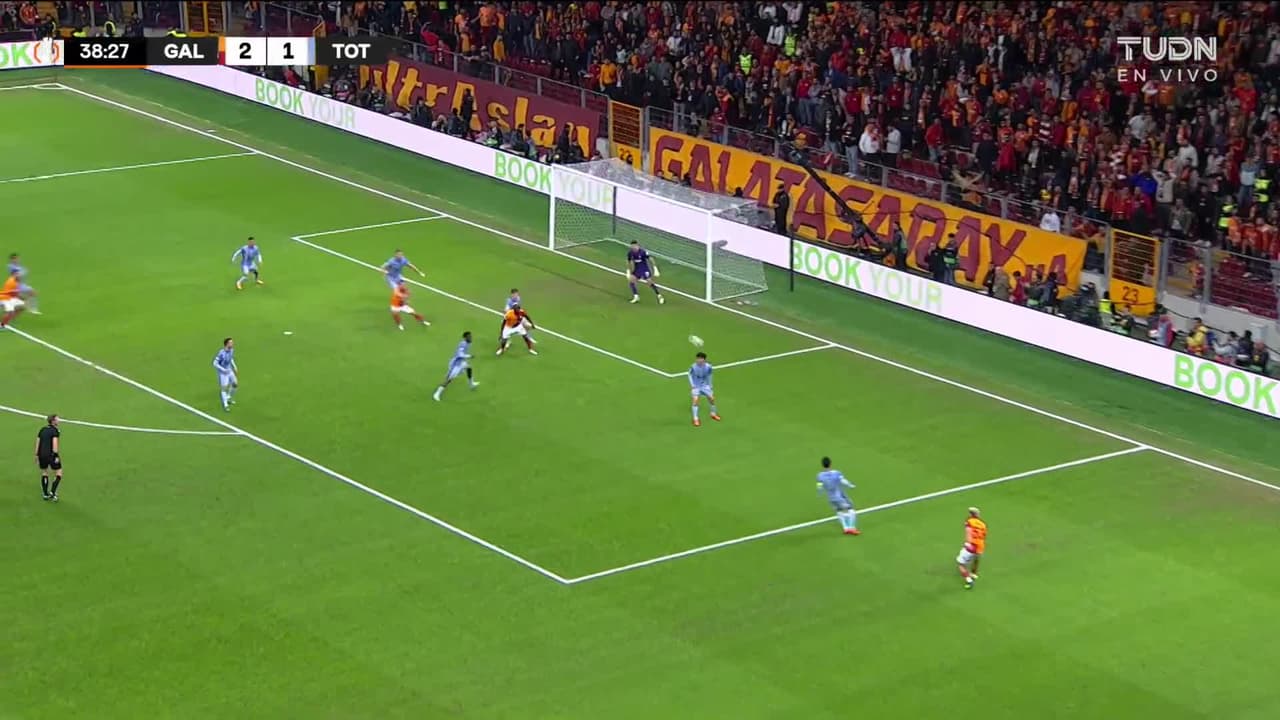 Tiro atajado raso al centro del arco. Victor Osimhen (Galatasaray) Disparo con la derecha desde el centro del área. Asistencia de Yunus Akgün después de un pase en profundidad.
