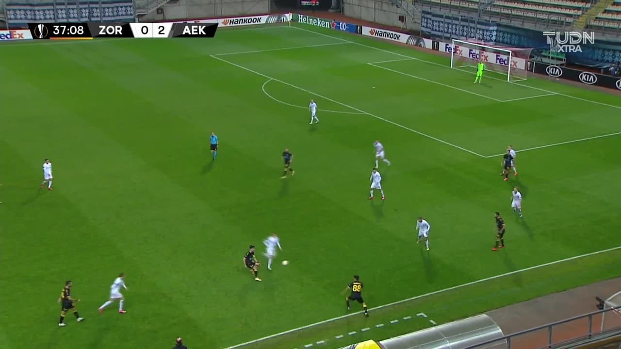 Tiro atajado. Petros Mantalos (AEK Athens) disparo de cabeza desde el centro del área.