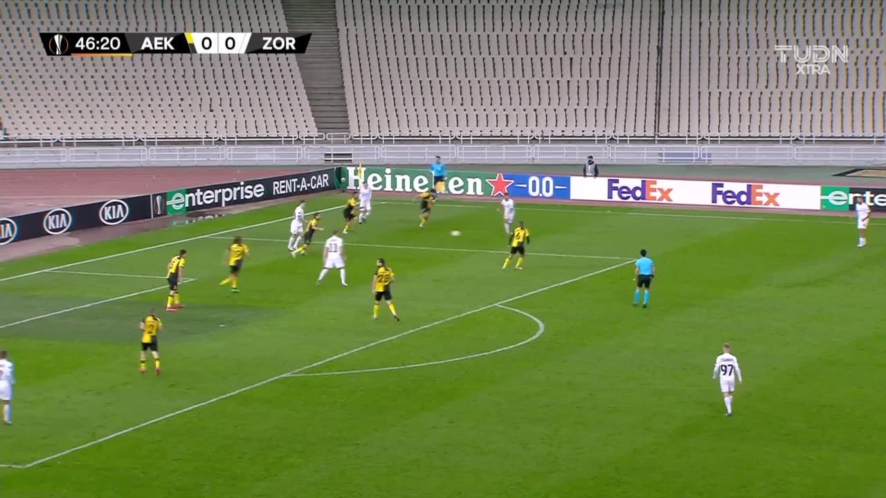 Tiro atajado. Vladyslav Kochergin (Zorya Luhansk) Disparo con la derecha desde el lado izquierdo dentro del área.